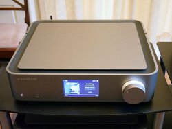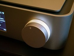 また、本体中央にディスプレイを装備。再生中の楽曲のジャケットや楽曲情報、Wi-Fiの接続状況などを表示できるほか、ボリュームノブを押すと各入力が円上に並んで表示され、直感的に選択することができる。