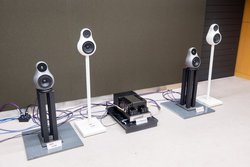 また、こちらも来春以降の発売となる2ウェイ・バスレフ型のブックシェルフスピーカーの試作品が展示。9月に発売されたスピーカースタンド「BST-60L」と組み合わせてデモで使用されている。