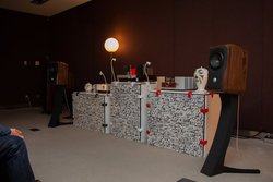 部屋のもう一方では、PATOHSの真空管プリメインアンプ「Twin Towers」「Logos Mk II」「Classic Remix」に、charioのスピーカーを組み合わせて演奏を行っていた。