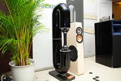ユニークな新スピーカーも披露。The Bay Radial Speaker Systemというブランドの“放射スピーカー”「Courante」は、パイプを折り曲げたようなその形状にまず驚かされる。C字型に折り曲げられたパイプ形状キャビネットの両端を繋ぐように配置された円筒形メンブレン(膜)がトゥイーターの振動板となっており、これが360度にわたって音を放射する。また、円筒の両端にはエジプト製パピルスコーンを用いたウーファーが配置されている。パイプ形状のキャビネットはカーボン製だ。