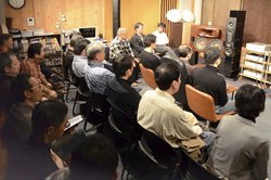 当日は、おそらく世界初のオーディオのクオリティアップ比較試聴であろう「“マイ柱”電源」と「燃料電池」の音質の違いを、自らの耳で体験したいと集まった参加者18人で会場は満席。