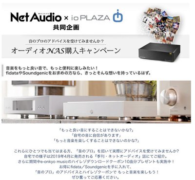 本キャンペーンは、小社刊行誌『季刊・ネットオーディオ』編集部とのコラボレーションで行われるもの。期間中にioPLAZAの本店、楽天店、Yahoo! 店でSoundgenicおよびfidataのオーディオNASを購入したユーザーの中から抽選で2名様に、ネットワークオーディオに精通した評論家が自宅へ訪問し、音や使い勝手のアドバイスが受けられるというものだ。また、自宅での様子は2019年4月19日発売となる『季刊・ネットオーディオvol.34』でも紹介されることになる。