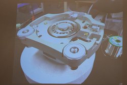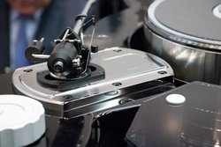 プラッターはエアーベアリングによって10ミクロン浮上して回転する。また、プラッターベースの45cm円周上の加工精度は8ミクロン以下に抑えられているという。