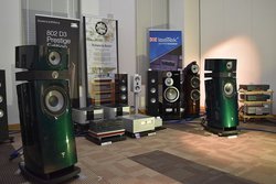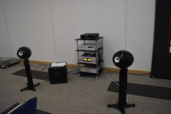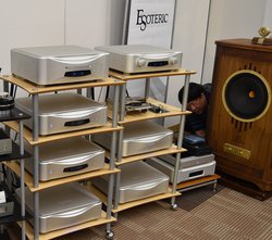 例えばエレクトリとハーマンインターナショナルとエソテリック、エイ・アンド・エムが出展するBルームでは、アヴァンギャルドとタンノイ、JBL、マジコのスピーカーが同じ場所に設置。その間には、マッキントッシュとマークレビンソン、エソテリックとエアタイトのアンプが林立。アヴァンギャルドのスピーカーをマッキントッシュのアンプとメトロノームのCDプレーヤーで鳴らし、その操作をエソテリックの担当者が行う。