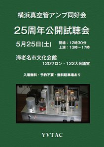 神奈川県横浜近辺を活動拠点としているオーディオサークル「横浜真空管アンプ同好会(Yokohama Vacuum Tube Amplifier Club)」は、設立25周年を迎え、これを記念した公開試聴会を海老名市文化会館にて5月25日に開催する。