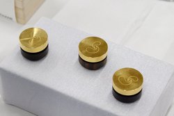 KRYNA(クライナ)はケーブルに巻きつけて使用するインシュレーター「Helca 1」を、アナログプレーヤーから伸びるフォノケーブルに実際に装着した様子を展示。また三進興産が手掛けるソルボセインサウンドインシュレーターは、上部に真鍮、中部に黒檀、下部に衝撃吸収素材 “ソルボセイン” を用いたハイブリッド3層構造のインシュレーター。その仕様について、興味深そうに来場者が質問をしていた。