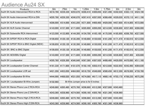一例を挙げると、ケーブル「Au24 SX Audio Interconnect RCA to RCA(5m)」が従来202,800円に対して、新価格では218,790円となる。そのほか対象製品の詳細と価格は以下の画像の通り。
