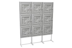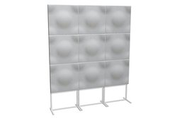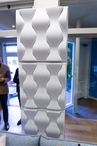 1セットはパネルが縦に3枚並んだ状態となっており、外形寸法は588W×2170H×335Dmmで、質量は12.3kg。横への連結にも対応するため複数セットを並べて使用することもできる。標準仕様はモノトーンカラーで日本の家屋にフィットしやすく、また複数台での使用時には美しい造形を構築でき、ルームチューニングとインテリアの両面で機能するとアピールする。