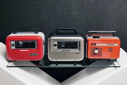 さらに来場者の注目を集めていたのは、ホンダポータブル電源の原点ともいえる初期の発電機も置かれていたこと。ホンダは1959年から発電機の開発を始めていたとのこと。当時の製品は、もちろんリチウムイオン充電池ではなく、小型エンジンを搭載し、ガソリンでエンジンを回して発電するものだが、サイズ感は今回のLiB-AID E500 for Musicとほぼ同じ。持ち運びやすさと機能のバランスを考えると、このサイズに行き着くということだろうか。