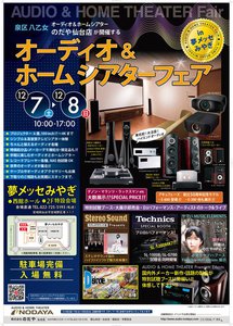 オーディオ専門店「のだや」は、「オーディオ&ホームシアターフェア」を12月7日 - 8日に仙台にて、14日 - 15日に福島にて開催する。会場は、仙台が夢メッセ西館1Fホールと2F各特別試聴ブース10部屋。福島がビッグパレットふくしまコンベンションホールA/B、マルチパーパス1.2となる。