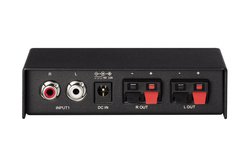 入力は背面にRCA、前面にステレオミニジャックを1系統ずつ装備。外形寸法は110W×30H×75Dmm(最大突起物含む)で、質量は約250g。1.5mのステレオRCAケーブルと0.8mのステレオミニケーブルを1本ずつに、1.5mのスピーカーケーブルを2本、ACアダプター1つが付属する。