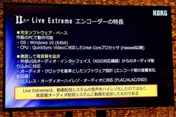 Live Extremeは、これらの問題の解決としても大きな意味を持っている。Live Extremeは「ソフトウェアベース」で動くことも大きな特徴で、Windows10 64bit、CPUがQuickSync Videoに対応したIntel Coreプロセッサーがインストールされた市販のPCで動かすことができる。これは、コルグがハードウェアだけではなくAudioGateやPrimeSeatなど、ソフトウェアからの音質的な取り組みを長年にわたって積み重ねてきたことが背景としてある。