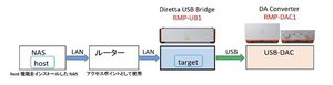 オーディオ伝送技術「Diretta」に対応した同社製USBブリッジ「RMP-UB1」との接続を主に想定したUSB-DAC。Direttaによる高品位なワイヤレス伝送で「RMP-UB1」がNASから受けた音楽データを、同社が提唱する“リアルサウンド”によって、本機が再現するとしている。