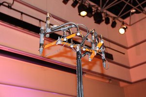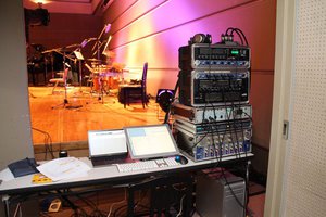 当日会場へ行くと、椅子の上にはM-AUDIOのポータブル・へッドホン・アンプ「Bass Traveler」が用意されており、ラフミックスされたステレオ音声が客席まで届くよう配線がされていた。このヘッドホン・アンプに各自持参したヘッドホンを接続すれば、演奏・収録している音をリアルタイムで聴くことができるというものだ。