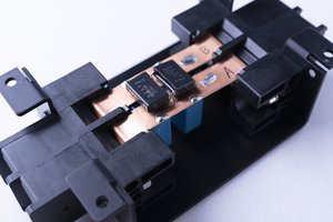 フィルタを構成するフィルムコンデンサ群は、ブスバーに直接実装。ブスバーによるストレート近接並走配線によって、パワーライン間の浮遊容量を利用するとともに、不要なインダクタンス成分の発生を抑え、より効果的なノイズリダクション効果を得るとしている。