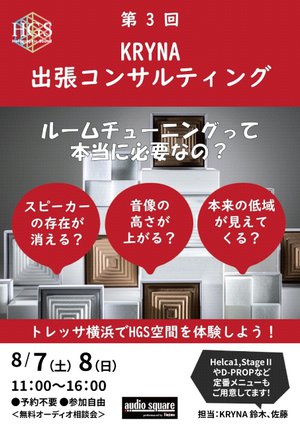 KRYNA(株)は、同社のルームチューニングアイテムの比較試聴ができるイベント「出張コンサルティング in トレッサ横浜」の第3回を、8月7日(土)、8日(日)に開催する。場所はノジマ オーディオスクエアトレッサ横浜店。試聴室にルームチューニングアイテムを持ち込み、その効果を“ビフォー・アフター”で体験できるイベントとなっている。