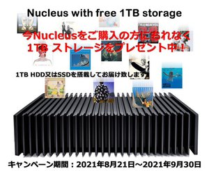 太陽インターナショナル/オリオスペックが取り扱うRoon専用サーバー「Nucleus」「Nucleus+」について、1TBのストレージがプレゼントされるキャンペーンが実施されている。9月30日までの購入が対象で、Nucleusには1TBのHDDが、Nucleus+には1TBのSSDが付属する。