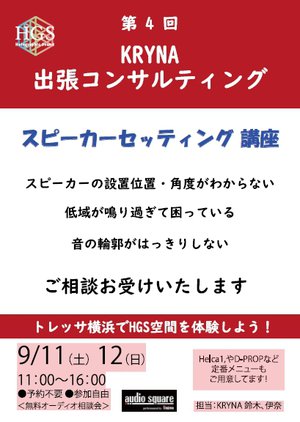 KRYNA(株)ではこの9月、「スピーカーセッティング講座」をテーマにした2つのイベントを実施する。