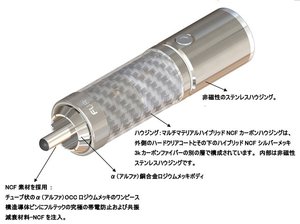 RCAプラグ「CF-102 NCF」は、チューブ状のαOCCロジウムメッキのワンピース構造導体品にNCFを注入。ハウジングは、外側のハードクリアコートとその下のハイブリッドNCFシルバーメッキ3kカーボンファイバーで構成される。内部には非磁性体ステンレス鋼ハウジングを採用し、音のバランスを改善するとしている。導体線はネジ止めによる結線、最大ケーブル適応径は11mmとなっている。