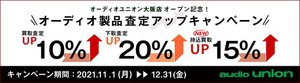 また大阪店のオープンを記念し、オーディオユニオン全店舗にて「オーディオ製品 買取査定10%、持込買取15%、下取査定20%UPキャンペーン!」も開催される。買取、下取査定UPは宅配サービス利用時にも適用されるとのことで、実施期間は大阪店が12月30日(木)までで、そのほかの店舗は12月31日(金)まで。