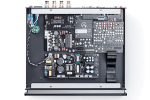 特別仕様のクラスDアンプモジュール「Hypex UCD102」を搭載し、60W+60W(8Ω)/100W+100W(4Ω)の駆動力を実現。ディスクリート構成により安定した電圧を供給できることに加え、クラスDの利点を活かして回路基板にヒートシンクを直接配置する設計により経路を大幅短縮。出力デバイスもスピーカー端子に直結させるケーブルレスとすることで高音質化を図っているとのこと。