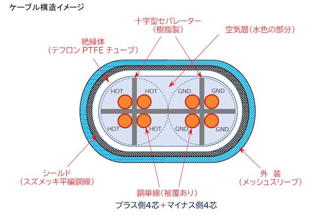 線材は銅単線による8芯構造で、その導体を覆う絶縁体はテフロンPTFEチューブを自ら楕円形に加工したものを採用(市販品は丸型のみ)。チューブを楕円形にすることで8芯構造の導体と十字型セパレーターをストレスなく収めることができる仕組み。