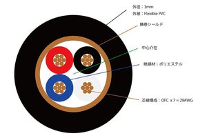 優れたノイズ耐性を持つ4芯シールド構造を採用、導体はOFCを同心円状に7本より合わせ、ポリエステルの絶縁材でまとめている。3mmという極細径とすることで、低価格と機械的安定性の双方を実現したとしている。切り売りケーブルについては、4月現在、正規取扱店舗であるオヤイデ電気で購入可能。