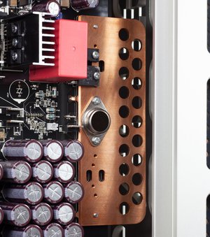 メインヒートシンクには、軽量かつ小型の銅板を採用。このヒートシンクはキャンタイプトランジスタへの給電バスバーを兼ねており、キャンタイプトランジスタの端子はバスバーを貫通し、直下の基板に直接マウントしている。その結果、音質劣化や不安定さを払拭し、「解放感や透明度」といった音質にも貢献しているという。