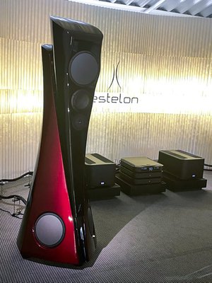エストニアのエステロンが発表した「EXTREME MK II」は、その威容と再生音の懐の深さに感服させられた。外観については、天井に届きそうな背の高さと、中高域用と低域用それぞれのエンクロージャーの関係を上下に連続的に変更したり、トゥイーターの位置を調整する電動の調整機構が来場者の目を釘付けにした。