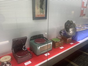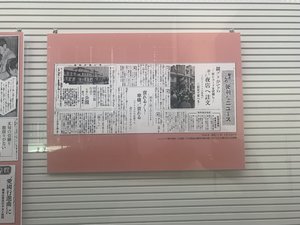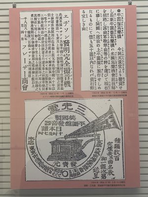 それらが再生されたと思われる卓上型蓄音器や、収録に使われていたヴィンテージマイク、また、読売新聞のアーカイブから、当時の新聞記事の切り抜きがSPレコードの変遷とともにパネル展示されている。