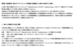 ディスクユニオンは、同社の個人情報漏えい事件について、経過報告となる第4報を同社サイトに掲載。外部調査機関による調査により、同社のオンラインショップ「diskunion.net」ならびに「audiounion.jp」に登録された個人情報の漏えいの事実が確認されたことを公表した。