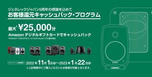 ジェネレックジャパンは、同社製品を購入すると最大25,000円のキャッシュバックが受けられる「お客様還元キャッシュバックプログラム」を本日11月1日より実施する。