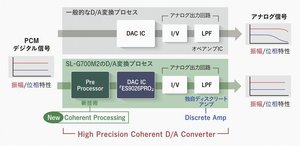 Coherent Processingは、PCM 192kHzまでの信号に対し、出力時に生じる振幅や位相特性の乱れを独自のデジタル信号処理で補正する技術。これはテクニクスのアンプ製品に搭載された、位相を整え理想的なインパルス応答を再現する「LAPC(Load Adaptive Phase Calibration)」の技術思想を応用したもので、より高精度なアナログ信号出力を実現するという。なお、352.8kHz、384kHzのPCM信号やDSD信号は本処理を通らず、ダイレクトにDACへと送られる。