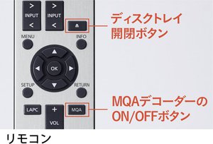 付属リモコンには、新たにディスクトレイ開閉ボタンとMQAデコーダーON/OFFボタンを搭載。使用頻度の高いボタンを載せたことで、より快適に操作できるとする。またディスク再生時は本体ディスプレイにトラックNo.と再生時間だけを大きく表示し、視認性を改善したという。