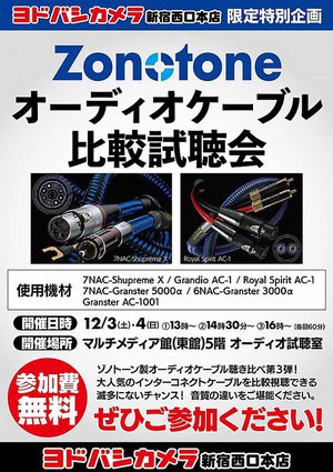 ゾノトーンブランドのオーディオケーブルを比較試聴できるイベントが、ヨドバシカメラ 新宿西口本店にて12月3日と4日に開催される。