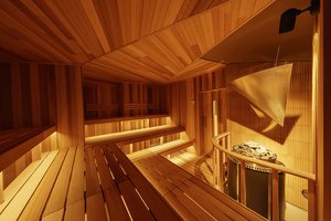 サウンドサウナには3段式のベンチが組まれており、最大15人ほどが入れるサウナ室となっている。その最下段のベンチ下にスピーカーが設置されており、テレビドラマ「サ道」の劇伴も担当した、とくさしけんご氏がこの部屋のために作曲したアンビエンス/チル系の音楽がループで再生されている。