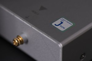 デザインもほぼ同じだが、「Jtune」モデルを象徴するホログラムステッカーを天面に配置。外形寸法/質量も同等で、元モデルにも付属する専用アースケーブルが計2本(RCA-Y端子×1、Y端子-Y端子×1/ともに1.2m)が同梱される。