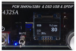 透明アクリル製の前面パネルには、電源スイッチ/MUTEスイッチ/ロータリーエンコーダー/OLEDを配置。OLEDには音量や再生中の入力端子、音源フォーマットが表示されるほか、ロータリーエンコーダーを押し込むことで音量の左右バランス調整や入力切り替え、OLED明るさ調整画面に切り替えることもできる。