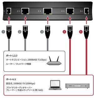 5つのポートのうち3つはオートネゴシエーションによる1000BASE-Tに対応、残り2つは100BASE-TXに固定されている。前者はルーターや汎用ネットワーク機器用、後者はオーディオサーバーやプレーヤーなどに最適なポートだとしている。