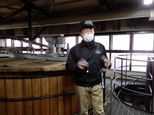 その後は工程見学を行った。ウイスキーの製造工程である【(1)仕込(2)発酵(3)蒸溜(4)貯蔵】という順序で実際に蒸溜所を見学し、各々のポイントの説明を受けた。説明はサントリー(株)ウイスキー事業部の尾下 治課長が担当。尾下氏は「季刊・アナログ誌」で何度も登場いただき多くの名ウイスキーを世に送り出した4代目のチーフブレンダー、輿水精一氏(現・名誉チーフブレンダー)のアシスタントを務め、現在は主に山崎蒸溜所のセミナー講師を務めている。