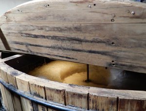 二条大麦を発芽・乾燥させて麦芽にする。それを砕き仕込み水と共に仕込槽へ投入。麦芽中の酵素によりデンプンが糖に分解された後、麦芽を細かく粉砕していることで、皮が下に沈み、層ができクリアな麦汁ができる。それをろ過することで、澄んだ麦汁をつくる。この時の仕込水は山崎の地で生まれた良質な水で、高い品質のウイスキーを生む大きなポイントとなる。仕込み槽は、大きさの異なる2つのタイプが用意されている。