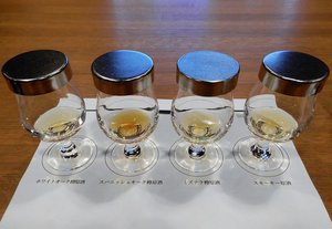 試飲したのは、ホワイトオーク樽原酒、スパニッシュオーク樽原酒、ミズナラ樽原酒、スモーキー原酒で、その香りと味わいは、それぞれ個性があり、樽熟成による原酒の違いが明らかに理解できた。これらの多彩な原酒をブレンドすることで、様々なウイスキーがつくられているのである。