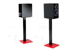 ESSE STANDはスピーカースタンド。新色 “Black Satin/Red” では底板に赤色を採用している。サイズは天板が150W×170Dmm、底板が230W×250Dmm。耐荷重は34kgまでとなる。本体の質量は5.56kg(ペア)。