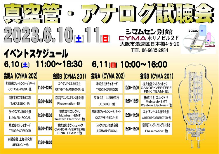 国内外の真空管アンプとアナログ関連ブランドが集結する「真空管アンプ・アナログ試聴会」が、6月10日(土)と11日(日)の2日間、大阪・シマムセン別館のCYMA 2Fにて開催される。参加は無料、予約不要。