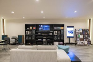 2Fはカーオーディオ向けの商談スペース。リビングのようなリラックスした空間で、スピーカーユニットの聴き比べやさまざまな制振素材の検討などができるようになっている。