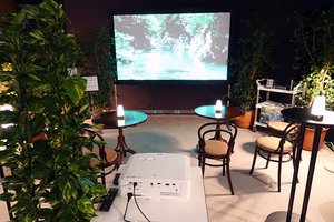 さらに、空間音響デザインソリューション「KooNe(クーネ)」も体験可能。同ソリューションは、独自に収録・編集した超高音質・高周波成分を含む森と川の音といった “ハイレゾ自然音源” と専用のハイレゾ音響システム、独自の空間音響設計を組み合わせたもので、今回のブースではプロジェクター「LX-NZ30」で環境映像も再生。さらに、BRAND Lab.が展開する、アロマをつかった空間演出も組み合わせたソリューション提案を披露している。