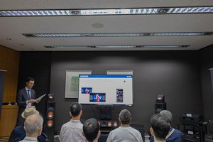 取材時はちょうどオンキヨー「TX-RZ70」のデモンストレーション時間で、東芝製パワートランジスタやこだわりのカスタムコンデンサーの選定やローパスフィルターを活用しノイズ成分を除去する音声処理技術VLSCの詳細を解説。長年培われてきたオンキヨーのアンプ技術に自信を見せる。