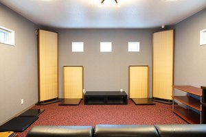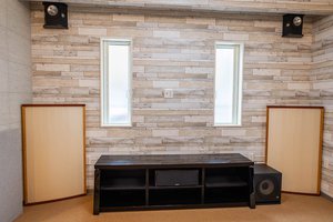 1Fはリビングシアターを構築予定。キッチン風のカウンターも用意されており、普通のご家庭のリビングをイメージしてもらいやすいシステムプランを計画中。天井にもスピーカーが埋め込まれており、ドルビーアトモスなどの提案もなされる模様。