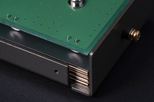 さらに、プラグ型仮想アース「Crystal Ep」に搭載される特殊アルミ電解コンデンサを6基採用。導体表面に特殊エッチング処理を施しており、海綿体構造に似た空洞が無数に形成されている。さらにコンデンサを両面ベタパターンレイアウントのプリント基板に実装し、導体表面積の拡大に成功しているという。