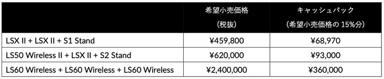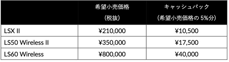 購入対象となるモデルは、ワイヤレススピーカー「LS60 Wireless」「LS50 Wireless II」「LSX II」の3モデル。キャッシュバック金額は商品価格(税抜)から計算される。2セット以上は同時購入が必須なほか、同じスピーカーの購入も対象となる。
